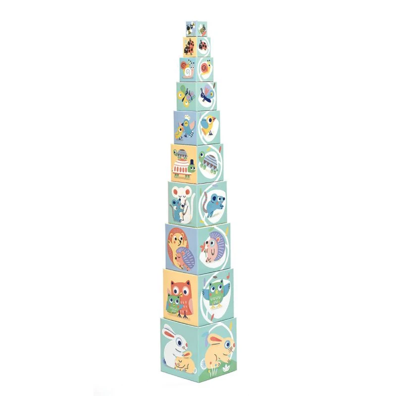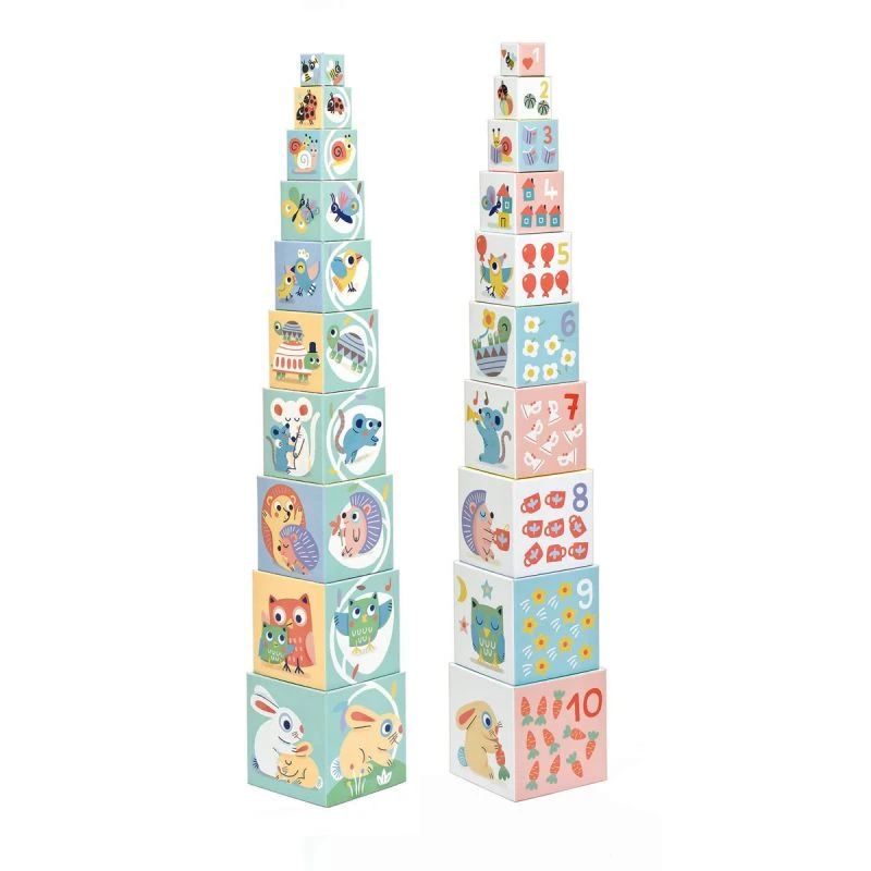 BabyBloki est un jeu de cubes à empiler de la collection Baby blanc de Djeco. Cette collection est caractérisée par des couleurs pastel très douces et des illustrations adaptées aux jeunes enfants dès 12 mois. Cet ensemble de 10 cubes à emboîter ou superposer permettra à bébé d’exercer sa dextérité et sa logique. Les cubes présentent sur 4 de leurs faces des illustrations que l’enfant pourra coordonner. Sur une face, les cubes sont numérotés de 1 à 10 du plus petit au plus grand avec des petits dessins répétés autant de fois que le chiffre indiqué et qui permettront aux enfants une première approche des chiffres.