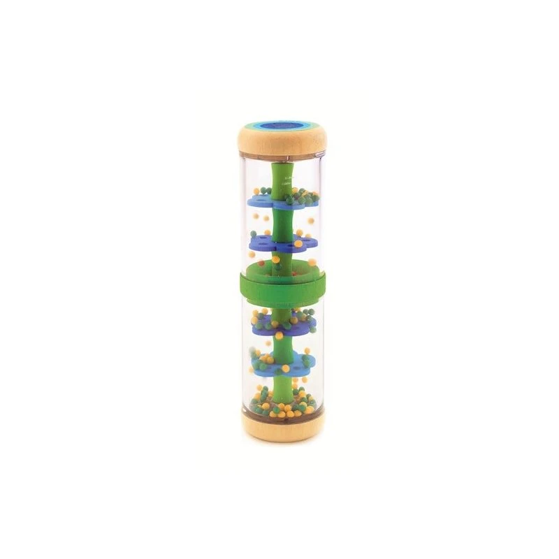 Les bâtons de pluie émerveillent les enfants avec la danse des billes qui s’écoulent lentement dans le bâton en faisant un bruit semblable à la pluie. Mélangeant le bois naturel et le plastique de couleurs verts et bleus avec des billes jaunes et vertes, ce bâton de pluie mixe habilement les matières et les couleurs.
