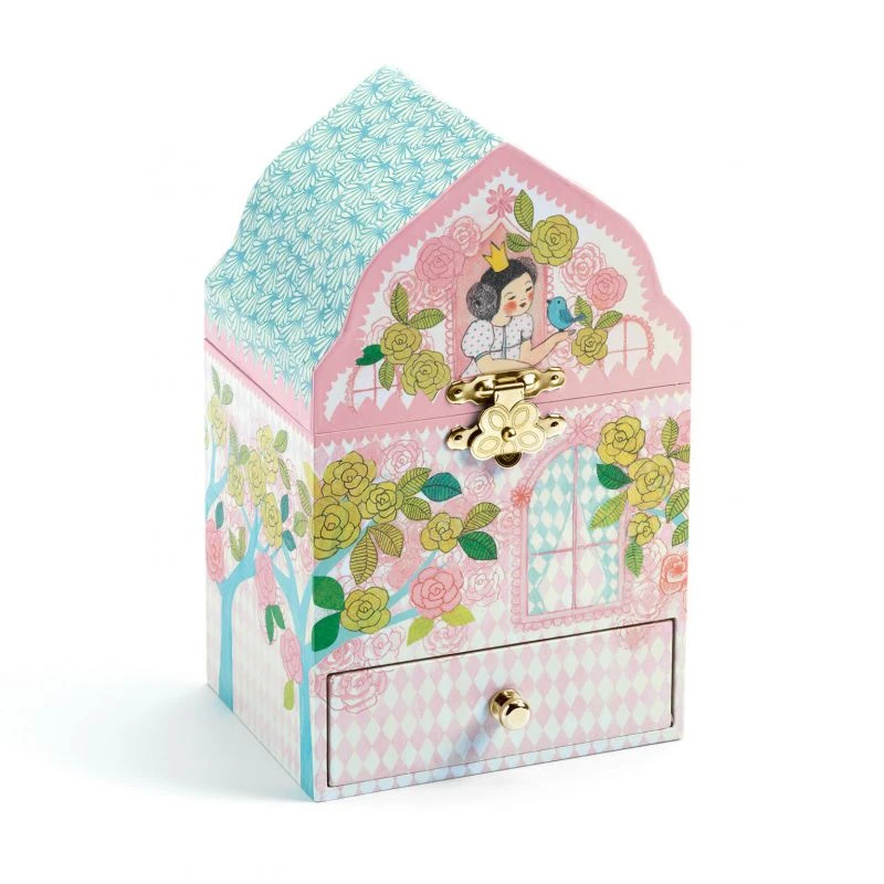 Palais enchanté est une boîte à bijoux musicale originale qui prend la forme d’un palais princier. Les couleurs pastels sont très douces et les illustrations d’arbres fleuris qui recouvrent le palais sont très poétiques. La boîte à musique est composé d’un tiroir et d’un grand coffre. Lorsque l’on ouvre la partie supérieure la princesse dansera au rythme de la musique.
