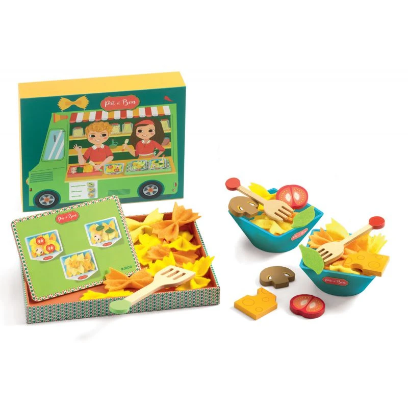 Pat et Ben vous attendent dans leur food truck pour vous servir d’appétissantes salades de pâtes. Cette dînette en bois et feutrine comprend tout le nécessaire pour composer des salades de pâtes : des pâtes bien sûr, des rondelles de tomates, des tranches de champignons et de gruyère et du basilic. Vous trouverez également 2 bols et 2 fourchettes et une spatule pour servir les clients.
