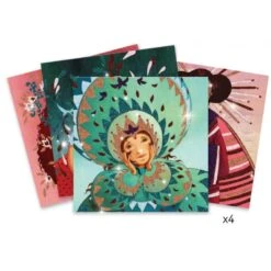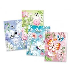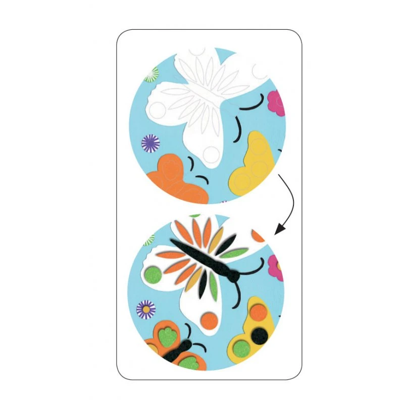 Coffret facile d’utilisation avec ses 4 planches illustrées de 20 x 20 cm, 114 gommettes de feutrine autocollantes et son livret explicatif pas à pas