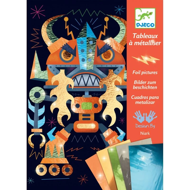 Nouveau coffret de loisir créatif Djeco en ce début d’année 2018, voici les robots à métalliser. Ces quatre illustrations de robots futuristes vont petit à petit prendre vie lorsque les enfants vont déposer les feuilles de métal sur les parties pré encollées comme expliqué dans le livret pas à pas.