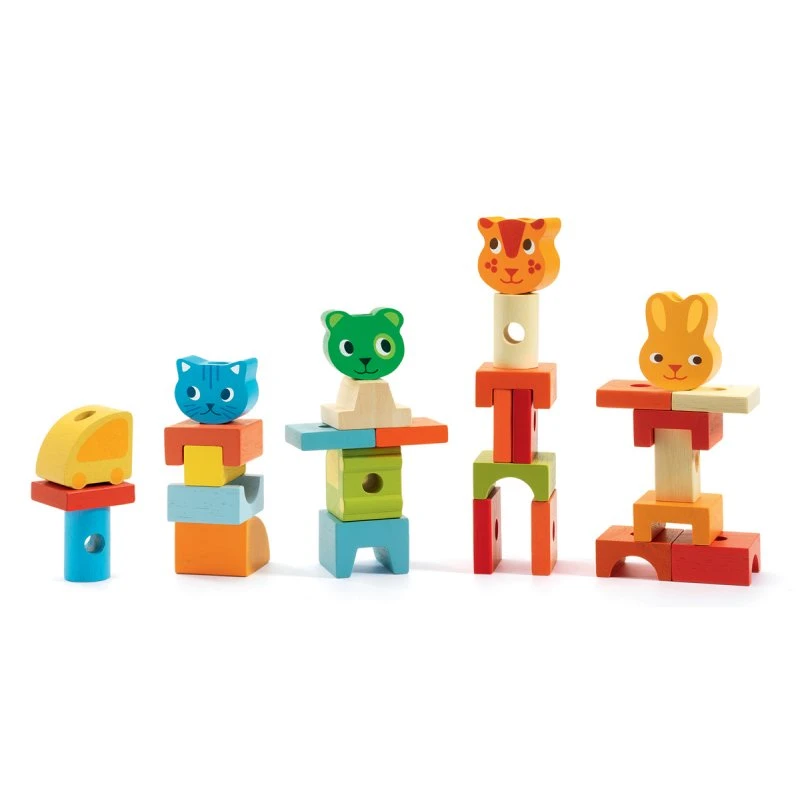 Un grand train composé de 4 wagons avec des tiges où l’enfant peut à volonté empiler les nombreuses pièces de bois. Les pièces sont de forme très variée offrant de très nombreuses possibilités d’empilement. L’enfant pourra jouer à empiler et emboîter les pièces avec ou sans le train et jouer avec les couleurs ou les formes.