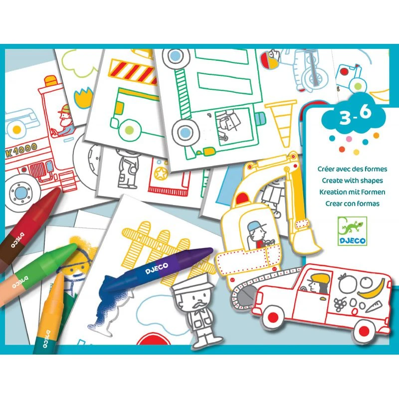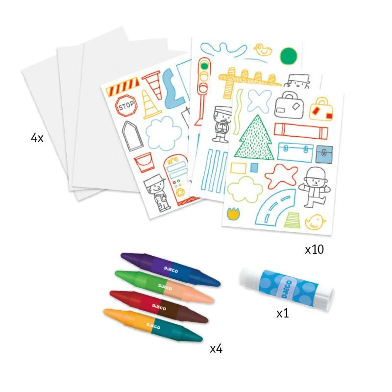 Un monde à créer est une nouvelle collection de loisirs créatifs Djeco comprenant des coffrets thématiques avec des pochoirs, des formes à colorier et à coller sur de grandes feuilles A3. Un monde à créer voitures propose à l’enfant de créer 4 grandes scènes sur la thématique des véhicules. Pour cela il disposera de formes prédécoupées qu’il pourra dans un premier temps colorier avant de les détacher de leur support et de les coller sur une grande feuille. Cette façon de procéder permet d’obtenir des dessins très propres car si l’enfant déborde sur les cartes prédécoupées, une fois détachées de la planche, les bords sont nets.