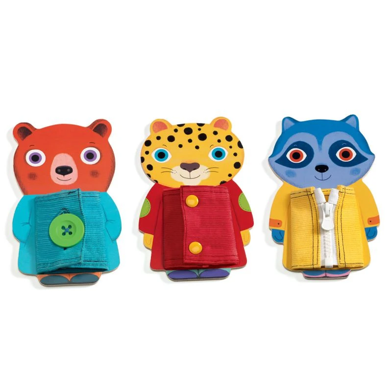 Ce jeu conseillé aux enfants à partir de 3 ans leur permettra d’améliorer leur motricité fine. Les 3 mécanismes différents de fermeture éclair, bouton classique et bouton à pression leur permettront d’habiller les animaux. Ce jeu de manipulation est un jouet d’éveil classique et un bon moyen de développer la motricité fine et la coordination œil-main des petits.
