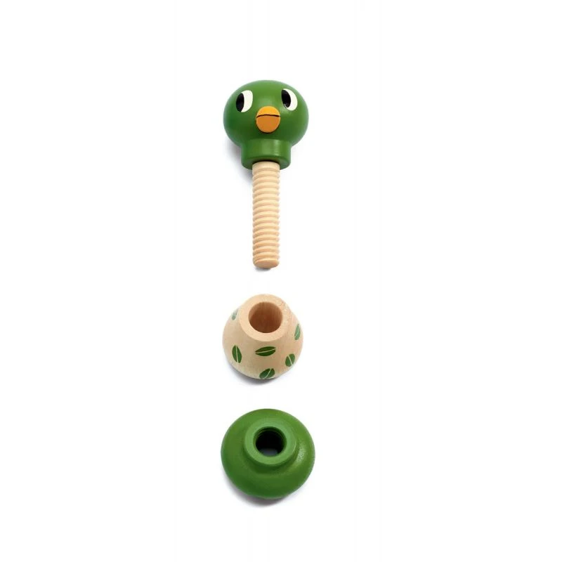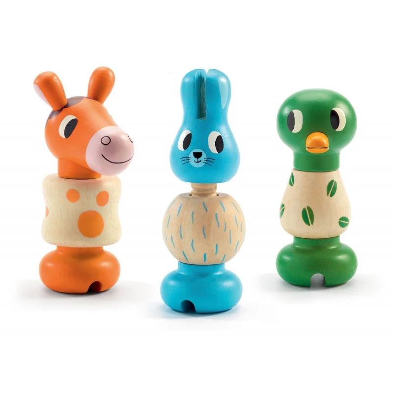Les jeux de vissage sont des grands classiques de jeux de motricité fine pour les jeunes enfants. Rondanimo de Djeco est un ensemble de 3 animaux sympathiques à visser : un cheval, un lapin et un canard. Les couleurs et les formes diffèrent mais le principe est le même. Chaque animal est composé d’une tête montée sur une tige filetée, d’un socle et d’un corps creux L’enfant devra enfile la tige dans le corps pour venir la visser dans le socle.