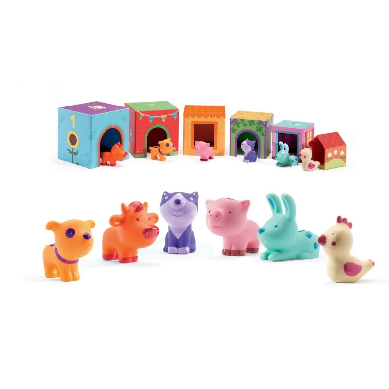 Djeco rassemble dans ce jeux des figurines d’animaux en plastique souple et des cubes à empiler qui font office de maison pour les animaux.